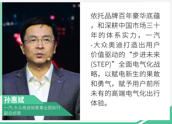 一汽-大众奥迪销售事业部执行副总经理孙惠斌先生:“一汽-大众奥迪将继续以用户为中心,积极落实用户价值驱动的全面电气化战略,致力于成为电气化时代用户最信任和最依赖的高端移动出行服务商。”