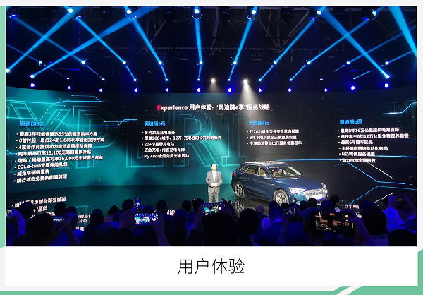 在用户体验(Experience)方面,孙惠斌先生介绍到:“我们将在成熟的豪华服务体系的基础上,进一步升级‘奥迪随e享’服务战略,提供贯穿奥迪随e购、奥迪随e充、奥迪随e行、奥迪随e保四个关键环节的22项服务举措。”