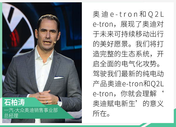11月18日,从官方获悉,奥迪在华全面电气化战略正式启动。该战略将依托体系支撑(System)、技术储备(Technology)、用户体验(Experience)以及产品布局(Product)四大举措,共同助力奥迪在华全面步入电气化时代。而作为新战略的开篇之作,奥迪e-tron和一汽-大众奥迪Q2L e-tron两款全新纯电动车型也迎来了上市。