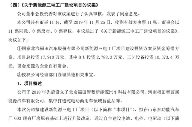 近日,福田汽车(SH600166)发布公告称,同意公司新能源三电工厂项目建设投资方案及资金筹措方案。该项目总投资1.79亿元,一期建设期为 2020-2022 年。