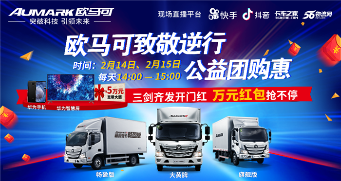 新年伊始,疫情肆虐而至,“自觉隔离 避免聚众”已然成为当下共识。作为国内高端中轻卡领导品牌,欧马可创新性地开展线上“公益团购惠”活动。借助微信、抖音、快手、卡车之家、56物流网等平台渠道,累计超过42万在线用户参与并观摩了这一盛况。