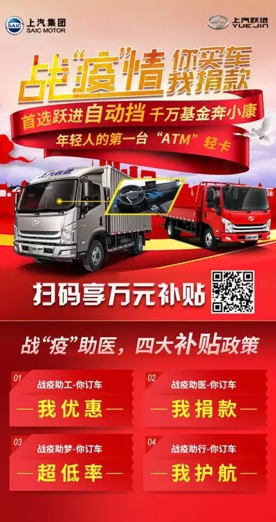 随着除湖北外各地疫情的有效控制,复工规模的扩大,我们战胜疫情的信心逐渐增强,广大卡友对早日复工表现出了迫切期盼。对此,上汽跃进发起了“战‘疫’情,你买车我捐款!千万基金助复工,全民战疫传递爱”活动。上汽跃进拿出1000辆AMT车型额度,补贴中小企业业主创业!