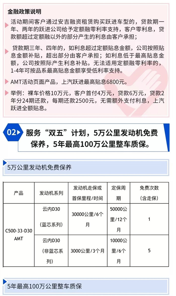 4、战疫助行--你订车,我护航。(购AMT车型,享服务“双五”计划:即5万公里发动机免费保养,5年最高100万公里整车质保!)