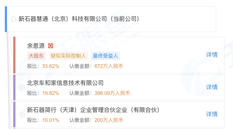 2018年5月,理想汽车的公司主体车和家加入了新石器的天使轮投资,具体融资数据未公布。天眼查数据显示,车和家在新石器持股19.82%,认缴金额396.09万元。