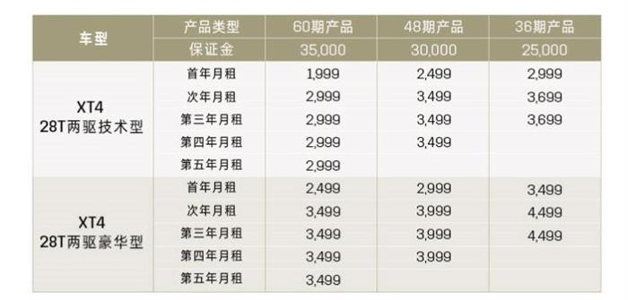 28T两驱技术型这一款车型,而且必须租满5年。这5年也只有第一年月租是1999,第二年月租会涨到2999。其他产品月租也都会按年递增。