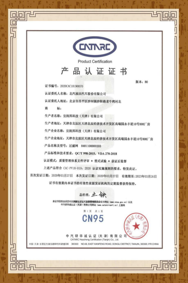 为了满足需求,福田汽车推出了满足CN95标准的车用空调过滤器产品,该产品在3月27日获得了中汽研华诚认证中心CN95认证,成为首批获得认证的商用车企业。根据规划,按CN95标准认证的车用空调过滤器产品率先在福田欧曼EST、拓陆者驭途、图雅诺、风景等车型上使用。