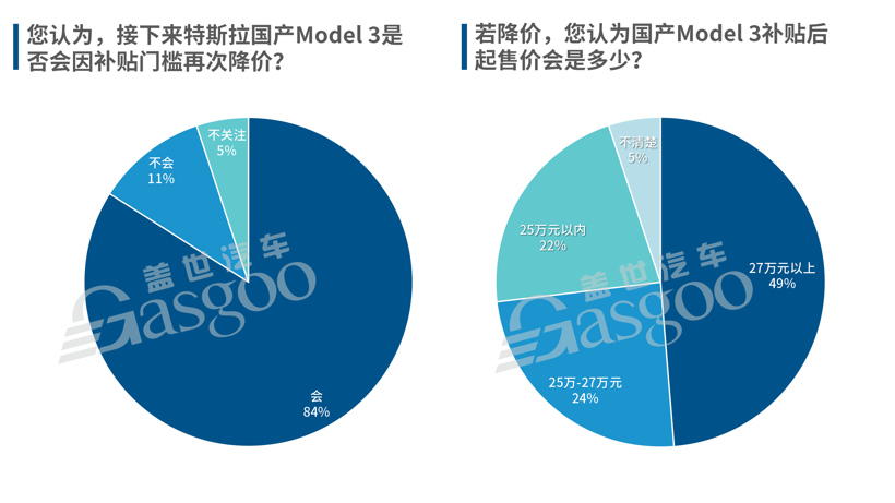 对此,据盖世汽车近日发起的一份有近一千五百人参与的调查显示,超八成的参与者认为国产Model 3会因补贴门槛再次降价,且有近五成参与者认为,国产Model 3补贴后起售价会在27万元以上,很显然,以上两点预测均已应验。