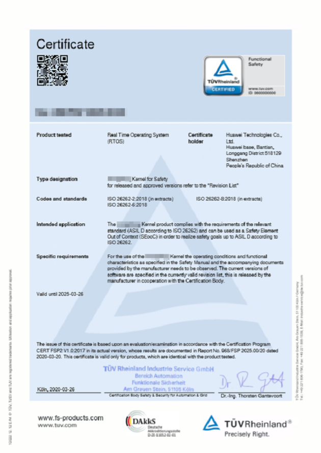 华为自动驾驶操作系统内核获得ISO 26262 ASIL-D认证证书
