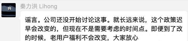 不过就在不久之前,有相关传言透露,蔚来将会取消首任车主免费换电政策。一时间蔚来车主开始感到焦虑,是不是出于成本方面的负担,免费换电政策将不再延续。对此,蔚来汽车联合创始人、总裁秦力洪率先表态:“谣言。公司还没开始讨论这事。就长远来说,这个政策迟早会改变的,但现在不是需要考虑的时间点。即便到了改的时候,老用户福利不会改变,大家放心。”