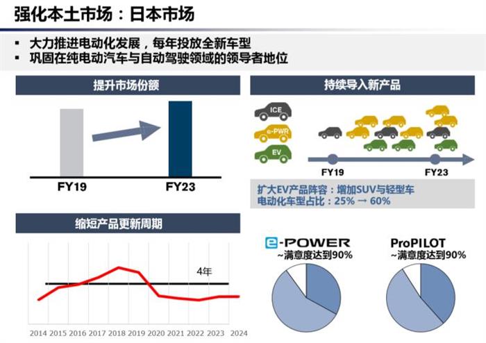 主场作战的日本首当其冲,成为日产的核心阵地。在这里,日产拥有更多的话语权和品牌优势,接下来的18个月内,日产将集中火力推出12款新车,在产品线上做足准备。此外,电动化也成为日产的发展重点,截至2023财年,日产汽车在日本本土电动化比例将达到60%,客户满意度超过90%,在全球范围,日产将努力使电动车销量超过100万辆。