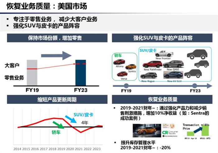 2、为降本增效,日产亮出“铁腕”,采取了削减固定成本费用、关闭利用率低下的工厂、合理化全球产品线等一系列举措,力争在2023财年末实现5%的经营利润率和6%的全球市场份额。