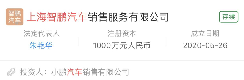 小鹏汽车于5月26日成立销售服务新公司—上海智鹏汽车销售服务有限公司。注册资本1000万人民币,法定代表人为朱艳华,小鹏汽车联合创始人何涛出任监事。