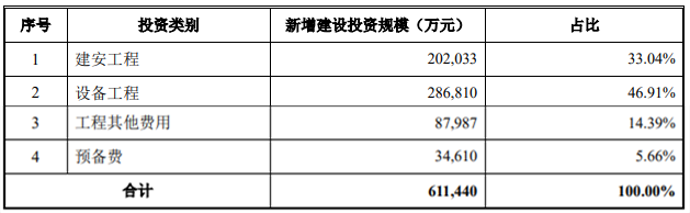 本项目的主要建设内容包括新建车架加工车间、车身联合厂房(冲压、焊接、涂装)、车身预制车间、总装车间、底盘车间、KD中心、联合厂房一、联合厂房二、综合站房、污水处理站、办公楼、检测中心、食堂、宿舍等建筑及安装工程投资;生产工艺设备、公用设备及其他设备及安装工程投资;厂区公用管线及试车跑道、道路广场、绿化、围墙等工程投资,及工程建设有关其他费用。本项目新增固定资产建设投资611,440万元的投资概算如下:
