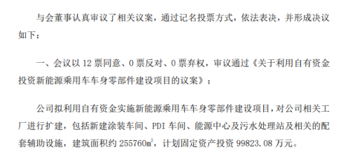 12月7日晚,江淮发布公告表示,七届二十三次董事会会议审议通过《关于利用自有资金投资新能源乘用车车身零部件建设项目的议案》。