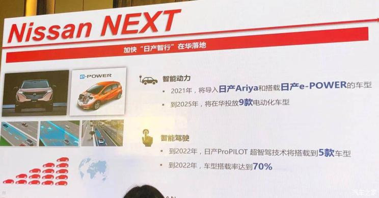 2021年1月6日,日产汽车官方公布了其2021年国内市场的发展规划,其中在产品层面,日产将引进纯电动SUV Ariya和一款e-POWER混动车型。与此同时,日产也将着重发展车辆智能化和网联化等方面。