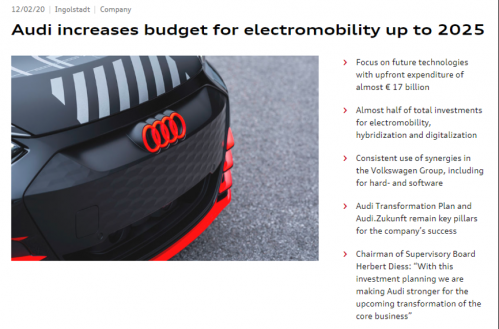 12月2日,奥迪汽车股份公司宣布,计划从2021年到2025年,在研发和固定资产投资方面支出约350亿欧元,旨在向网联化、可持续的高端出行服务提供商转型。这笔投资的具体用途包括:约170亿欧元用于开发未来汽车技术;约150亿欧元用于新能源转型。 [详细]