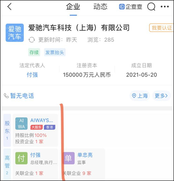虽然多数人认为爱驰汽车已经机会不多,但这家新创车企仍在努力。5月20日,爱驰汽车科技(上海)有限公司成立,注册资本为15亿元人民币,法定代表人为付强。