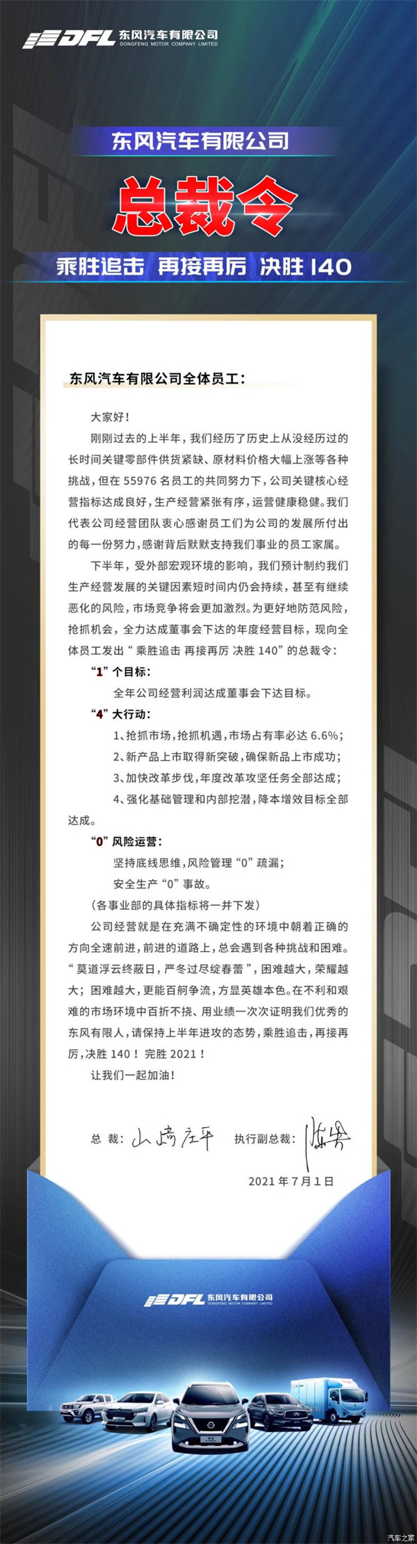 日前,东风汽车有限公司发布总裁令。经历2021年上半年长时间关键零部件供货紧缺、原材料价格大幅上涨等各种挑战,公司关键核心经营指标达成良好。