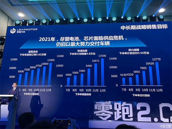 关于销量目标,零跑汽车称该品牌在2021年下半年的目标订单为5.62万辆,下半年计划销量4.8万辆,即便受电池、芯片等因素的影响,零跑汽车也计划在2021年下半年交付4.54万辆新车。中长期来看,零跑汽车的2025年目标销量将达到80万辆。
