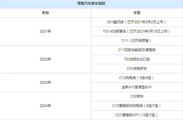 从布局表中可见,零跑计划在2021年推出S01双门轿跑(即S01酷玩版,2021年2月2日上市)、T03四门精品车(T03 400舒享版,2021年6月18日上市)以及C11(已开启预售)三款车型。2022年将推出C11四驱性能版及增程版车型、T03改款/出口版、C01纯电轿车。2023年推出C12纯电版车型、全新A11紧凑型SUV。2024年推出C02轿车、C13增程版和纯电版、C21增程版MPV车型。