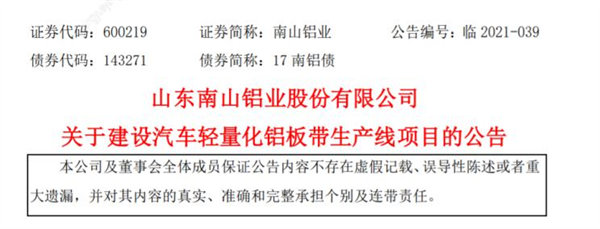 7月22日,南山铝业发布公告称,公司审议通过了《关于建设汽车轻量化铝板带生产线项目的议案》,拟投资建设汽车轻量化铝板生产线项目,项目总投资约为20亿元,其中设备费用12.4亿元,工程建设及其他费用7.6亿元,项目所需资金全部由企业自筹。项目建设期预计为18-30个月,项目建成后,每年将新增汽车轻量化铝板带产能20万吨。