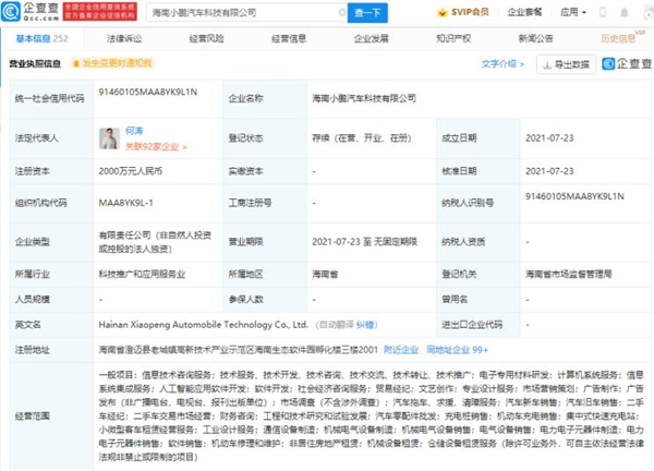企查查APP显示,近日,海南小鹏汽车科技有限公司成立,法定代表人为何涛,注册资本2000万元人民币,经营范围包含:充电桩销售、机动车充电销售、集中式快速充电站、小微型客车租赁经营服务等。股东信息显示,该公司由广州小鹏汽车科技有限公司100%控股。