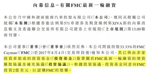 剩下的 4 千万美金来自和谐汽车。大家应该都还记得,拜腾最早叫 Future Mobility Corporation(FMC),这家公司最早孵化自和谐汽车、富士康和腾讯成立的「河南和谐富腾互联网加智能电动汽车新能源合伙企业」。2016 年 12 月 28 日,和谐汽车发布公告,宣布对 FMC 进行共计约 4 千万美金的投资。