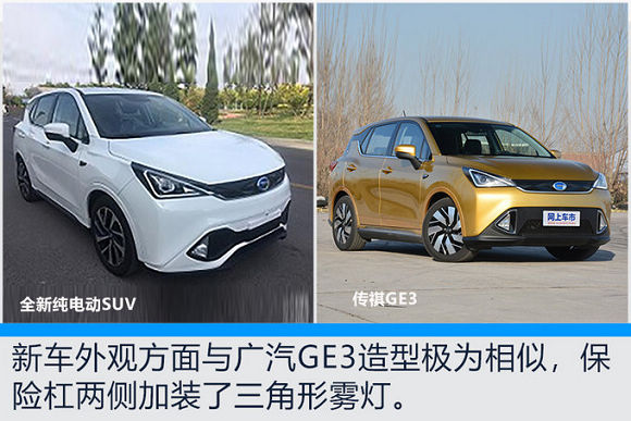 全新纯电动SUV在外观方面与广汽新能源GE3极为相似,前进气格栅采用了上下分体式设计,上中网为炭黑不规则面板,下方为网状格栅,保险杠两侧加装了三角形雾灯。为表明新能源身份,车前LOGO加入了蓝色元素。相比于广汽传祺GE3,新车仅在下保险杠区域做出了部分调整,两款车造型相差不大。动力方面,新车搭载最大功率为132kW,峰值扭矩290Nm的电动机,综合续航里程达到310km。