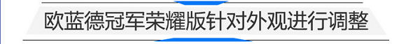 欧蓝德冠军荣耀版基于2.0L荣耀版打造而来,外观上针对黑色前防撞板、黑色格栅、门内饰板装饰条、仪表台装饰条、黑色行李架、外后视镜壳黑色涂装、黑色后防撞板、黑色门装饰板、轮毂涂装做出了调整。此外,新车还在车身上加入了三菱字母徽标,前整流板,侧整流板、扰流板和尾整流板。