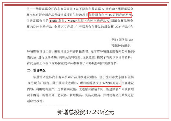 华晨雷诺金杯启动“华晨雷诺金杯汽车有限公司产品升级建设项目”,技改项目保持原有年产15万辆产能不变,引进雷诺公司的Trafic、Master车型(含纯电动),并新增金杯品牌金杯F50纯电动、金杯F70产品,生产双方合作开发的新金杯LCV轻型商用车产品(含纯电动)。该项目总投资37.299亿元,主要建设内容为:利用现有生产厂房和辅助设施,改造原有涂装车间、新建涂装车间及新增试车跑道,新增部分工艺设备、新增模具、夹具及检具,并对现有公共系统进行适应性改造。