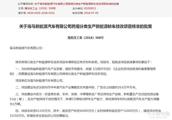 7月9日,河南省发改委发布《关于海马新能源汽车有限公司跨细分类生产新能源轿车技改项目核准的批复》,同意建设海马新能源汽车有限公司跨细分类生产新能源轿车技改项目。