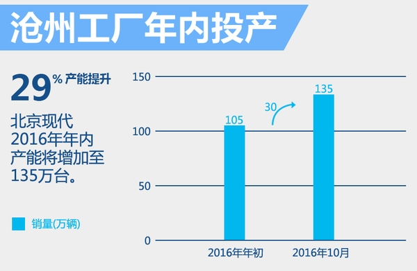 北京现代目前拥有3座整车工厂,且均位于北京顺义,总年产能为105万辆。需要指出的是,北京现代第四工厂——沧州工厂按计划将于今年10月竣工投产,将为北京现代带来30万辆的年产能提升,总年产能将增加至135万辆,将为完成更高的销售目标奠定基础。此外北京现代第五工厂——重庆工厂将于2017年投产,届时北京现代总年产能将增加至165万辆。
