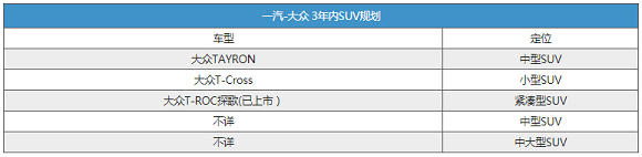在大众T-ROC探歌上市发布会现场,一汽-大众汽车有限公司副总经理赛德利公布了该品牌未来三年内SUV产品规划,其中包含TAYRON、T-Cross等五款车型。详情请看下表: