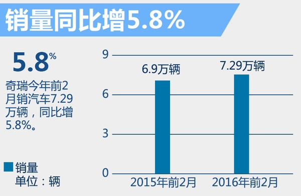 今年1月,奇瑞品牌共计销售汽车3.88万辆,同比增长5.3%,艾瑞泽及瑞虎两大系列的形成及完善给品牌带来销量增长态势。今年1-2月,奇瑞累计销量为7.29万辆,同比增长5.8%。