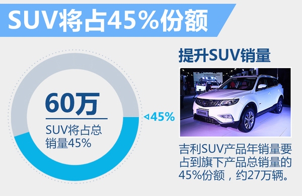 而根据吉利的设想,2016年是集团全面发力SUV市场的关键一年,多款实力车型的投放势必将带动旗下SUV业务的快速前进,该细分领域的销量预计将增长至全年60万辆目标的45%,即27万辆左右。届时吉利汽车的产品结构和销量分布将更加合理,对于其整体业绩都大有裨益。
