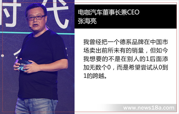 电咖汽车CEO张海亮在开场时回忆了离开传统体系加入电咖创业的心路历程:“我曾经把一个德系品牌在中国市场卖出前所未有的销量,但如今我想要的不是在别人的1后面添加无数个0,而是希望尝试从0到1的跨越。”