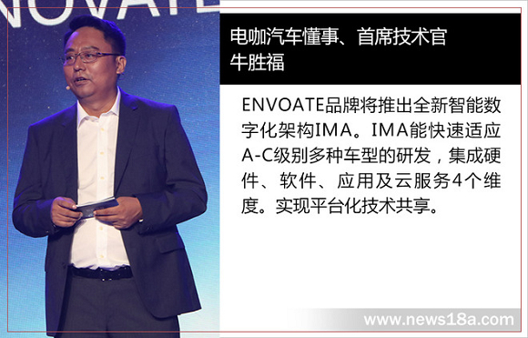 已拥有20多年造车经验的电咖CTO牛胜福在会上透露:“ENOVATE品牌将推出全新智能数字化架构IMA,能快速适应A-C级别多种车型的研发,集成硬件、软件、应用及云服务4个维度,实现平台化技术共享。未来,IMA可围绕用户出行场景提供智能化服务,同时支持软件快速迭代云端刷新,可综合智能驾驶、AI生活助手、语音控制等多种应用场景,打造数字化时代人机交互的极致客户体验。”