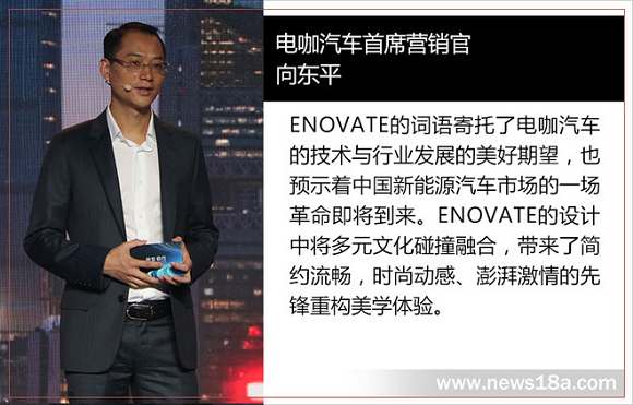 电咖汽车首席营销官向东平现场表示道:“ENOVATE的词语寄托了电咖汽车的技术与行业发展的美好期望,也预示着中国新能源汽车市场的一场革命即将到来。ENOVATE的设计中将多元文化碰撞融合,带来了简约流畅,时尚动感、澎湃激情的先锋重构美学体验。”