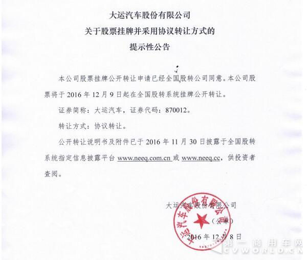12月8日,大运汽车股份有限公司发布关于股票挂牌并采用协议转让方式的提示性公告。公告显示,经全国中小企业股份转让系统公司同意,大运汽车股份有限公司于2016年12月9日(也就是今天)起在全国股转系统(新三板)挂牌公开转让,证券简称为大运汽车,证券代码870012,转让方式为协议转让。