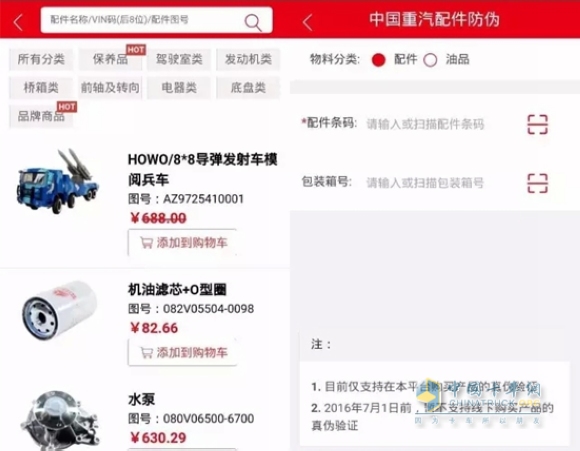 如果用户对于购买配件真伪有疑惑,只需使用智慧重汽APP端,通过扫描配件的包装码和条码,便可轻松验证配件的真伪;平台将根据系统记录,反馈给用户不同的查询结果,通过笑脸、疑问等直观展示给用户答复。