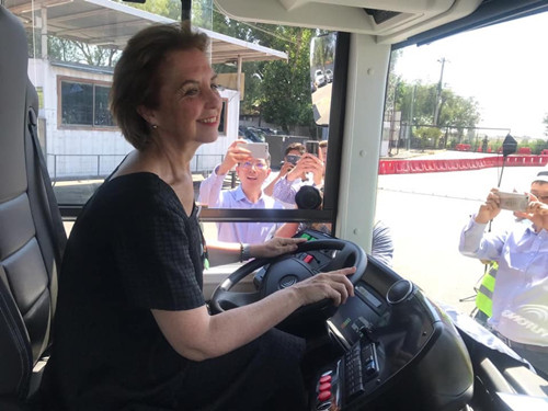 Hutt亲自登上了宇通E12纯电动客车,进行了乘坐体验。她对宇通的纯电动客车的环保性和静谧性赞不绝口。她表示:“该车配备了无线网和USB