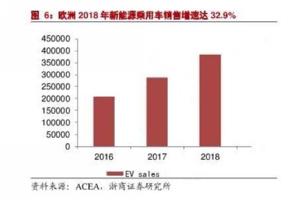 作为全球最早制定燃油汽车全面禁售计划的地区,欧洲率先实施了多项控制气体排放、支持新能源汽车发展的标准政策,如全球统一轻型车辆测试程序(WLTP)以及极其严格的二氧化碳减排标准。在日趋严格的排放要求的推动下,欧洲成为了全球第二大新能源汽车市场,并处在高速增长阶段。2018年欧洲市场共销售38.4万辆新能源乘用车,同比增长32.9%。