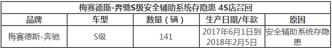 S级是梅赛德斯-奔驰旗舰级大型豪华轿车,目前以进口方式引入国内。网通社从国家质检总局缺陷产品管理中心了解到,部分S级由于多功能摄像头控制单元的软件参数不正确,导致主动式车道保持辅助系统可能不满足要求。受影响车辆辅助系统的防碰撞功能被削弱,存在安全隐患。此次,共有141辆车受到影响。