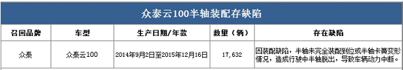 此次,湖南江南汽车制造有限公司将召回2014年9月2日至2015年12月16日期间生产的部分众泰云100汽车,共计17,632辆。
