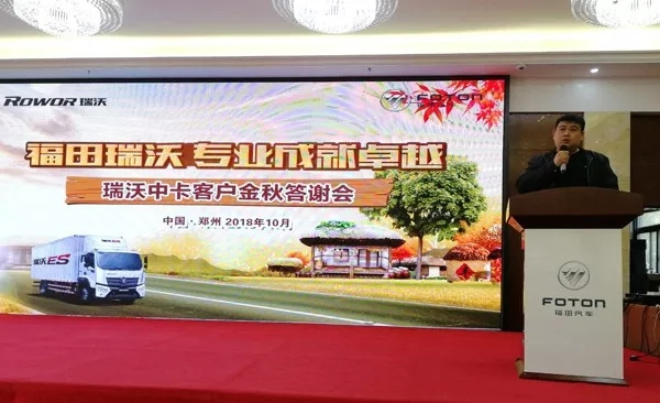 2018年10月23日,福田瑞沃在郑州市举行了中卡客户金秋答谢会,福田汽车时代事业部相关领导、福田康明斯中原大区经理冯军亮、河南华业汽车销售服务有限公司总经理丁小彬,以及经销商、物流企业用户、卡车司机代表、行业媒体等100多人参加了会议。答谢会期间,瑞沃ES5赢得了物流行业客户的高度认可,现场共订车168辆。