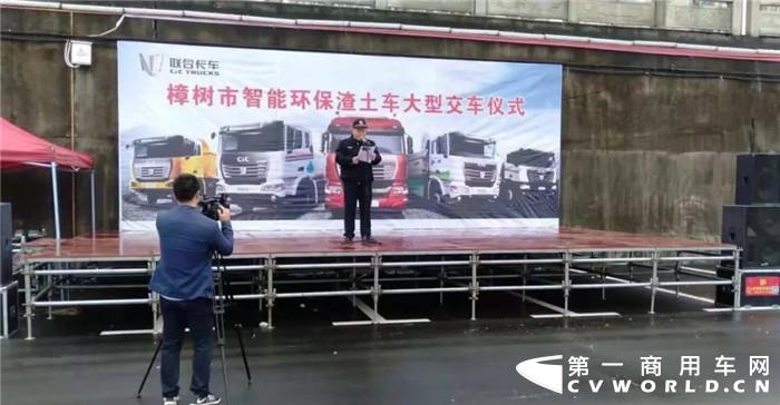 5日上午9点58分,交车仪式正式开始。首先是樟树市环境卫生管理处副主任致辞,他对樟树市城建过程中的环境卫生情况作了简短的介绍,并表示希望能够通过新的智能环保渣土车的投入运营,可以让樟树市的城市环境管理得到改善。