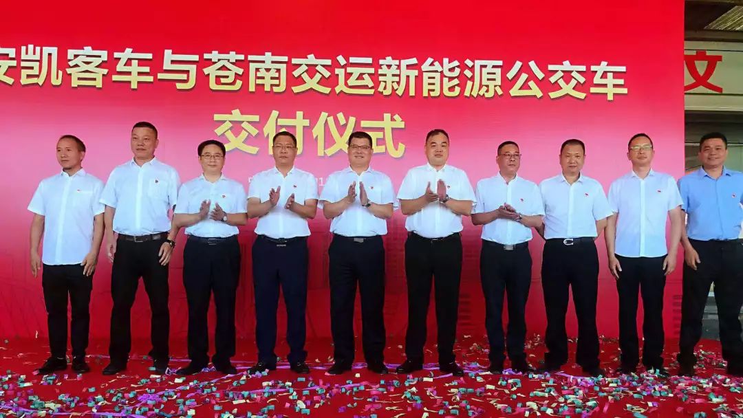 2019年9月6日,苍南县又一次迈出了“城乡公交一体化”的重要步伐,当天上午,安凯客车党委副书记缪传彬向苍南交运集团董事长、党委书记庄庆赢交付新车钥匙,49辆安凯纯电动公交车正式交付苍南县交通运输集团有限公司(简称“苍南交运”)。值得一提的是,这是继苍南交运在2018年底投运53辆安凯纯电动公交车后的又一大手笔。