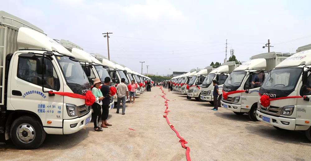 2019年7月8日,在山东莱州湾畔的古城昌邑,42台福田时代M3排列整齐,身披红花,等待交付。