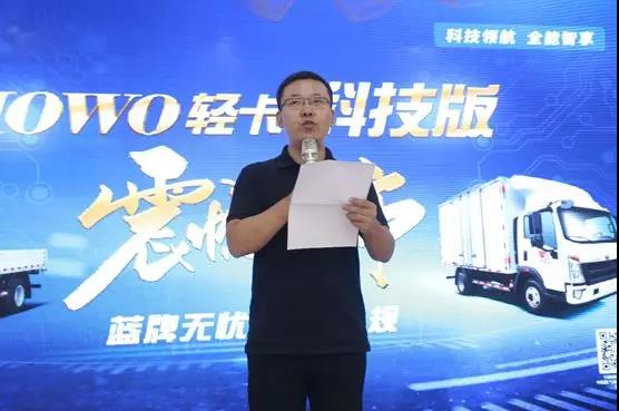 HOWO轻卡南京办事处经理贾继林先生上台致辞。重汽HOWO轻卡登陆连云港市场以来,销量以及市场份额都在稳定提升。作为厂家代表,贾经理对连云港客户朋友们的支持感到非常的感谢,并表示,重汽HOWO轻卡厂家将来会以更好的产品和更优质的服务来回报连云港客户朋友们,希望大家都开上重汽HOWO轻卡,走上致富道路。重点介绍了新上市的科技版车型,配备高端动力,整车科技感十足,强度好,重量轻,燃油经济性高。自重合规,蓝牌无忧,非常适合城际短途运输,非常值得广大卡友入手。