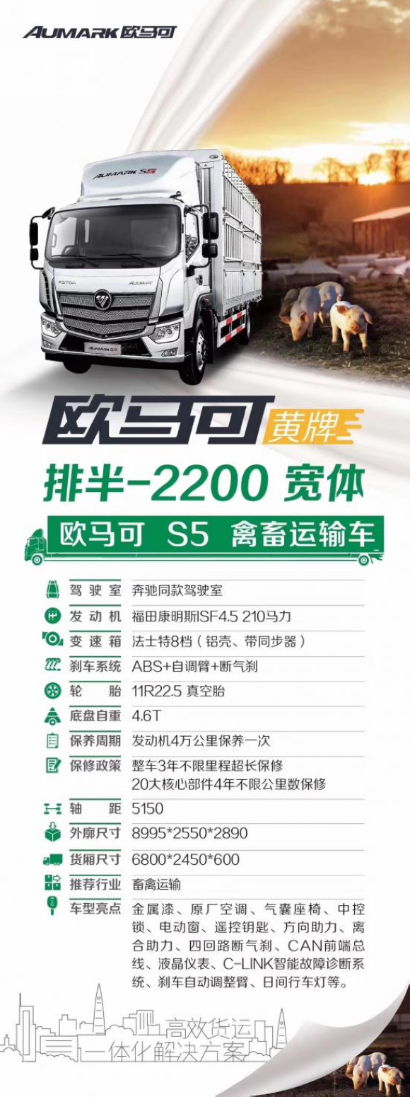 加之全系产品均搭载了康明斯为其量身定制的F系列发动机,以及采埃孚和法士特变速箱,充沛的动力性能和卓越的传动效率,可全面满足生猪和猪肉运输高效率与高可靠的需求;同时,宽敞乘驾空间、气囊座椅、环绕式仪表台以及变比大缸径转向器,全面提升产品的舒适性。加之全系标配的iFoton车联网系统,使整车更具智能化。换句话说,除了养殖之外,后面所有与猪肉相关的运输环节,欧马可都已经考虑周全。
